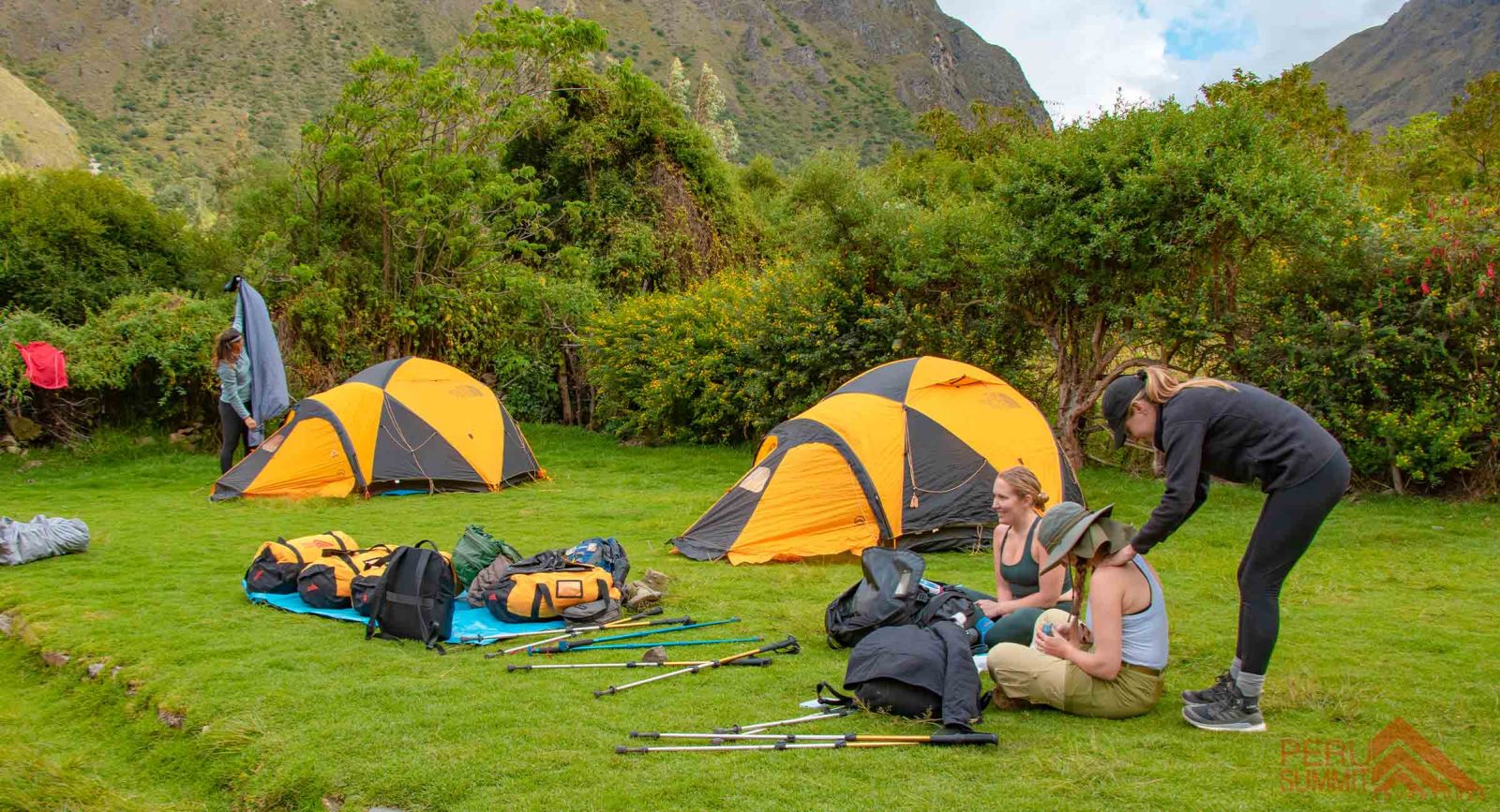 If the group consists of 9 participants, there will be an additional Group Sweep (assistant guide). On the trail, you will just carry your own daypack for the items that you want with you on the trail, such as a water bottle and a jacket or a camera. Our team of Inca Trail porters carries all your other gear in duffel bags from camp to camp. The altitudes at our campsites, our first camp is at 9,842 feet (3,000m), second camp at 11,975 feet (3,650 m), third camp at 8,694 feet (2,650m).